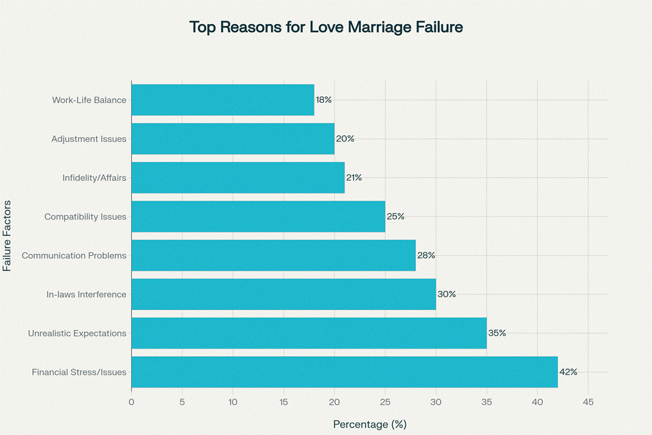 The primary factors contributing to love marriage failures in India, with financial stress (42%) and unrealistic expectations (35%) being the leading causes, followed by in-law interference and communication issues.