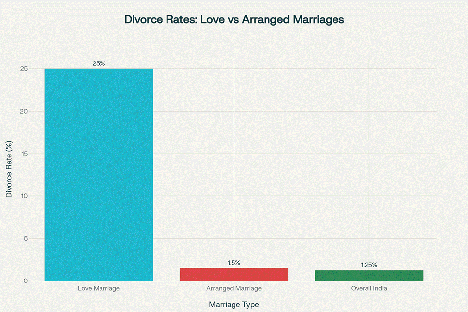 Comparison of divorce rates between love marriages and arranged marriages in India shows that love marriages have significantly higher divorce rates (20-30%) compared to arranged marriages (1-2%).
